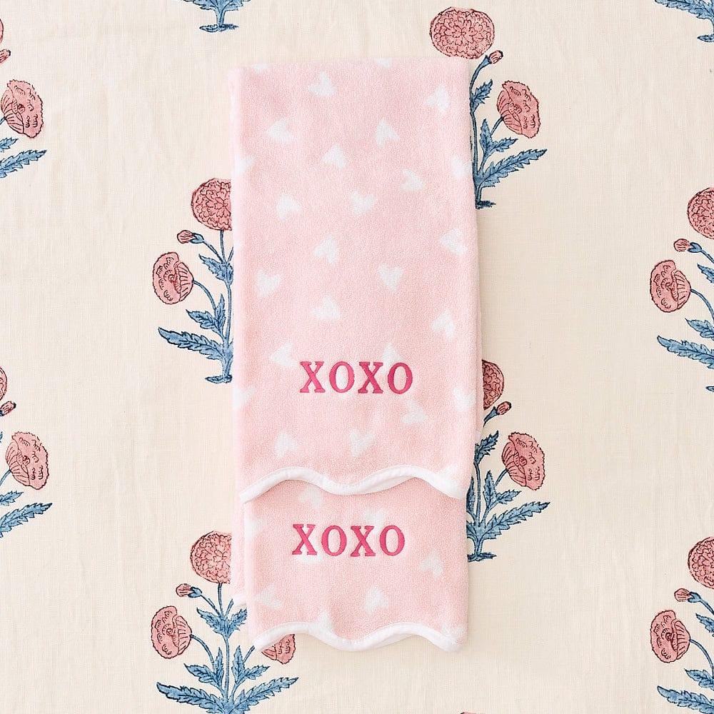 Patterned Scallop Hand Towels (pair) - Tossed Pink Hearts