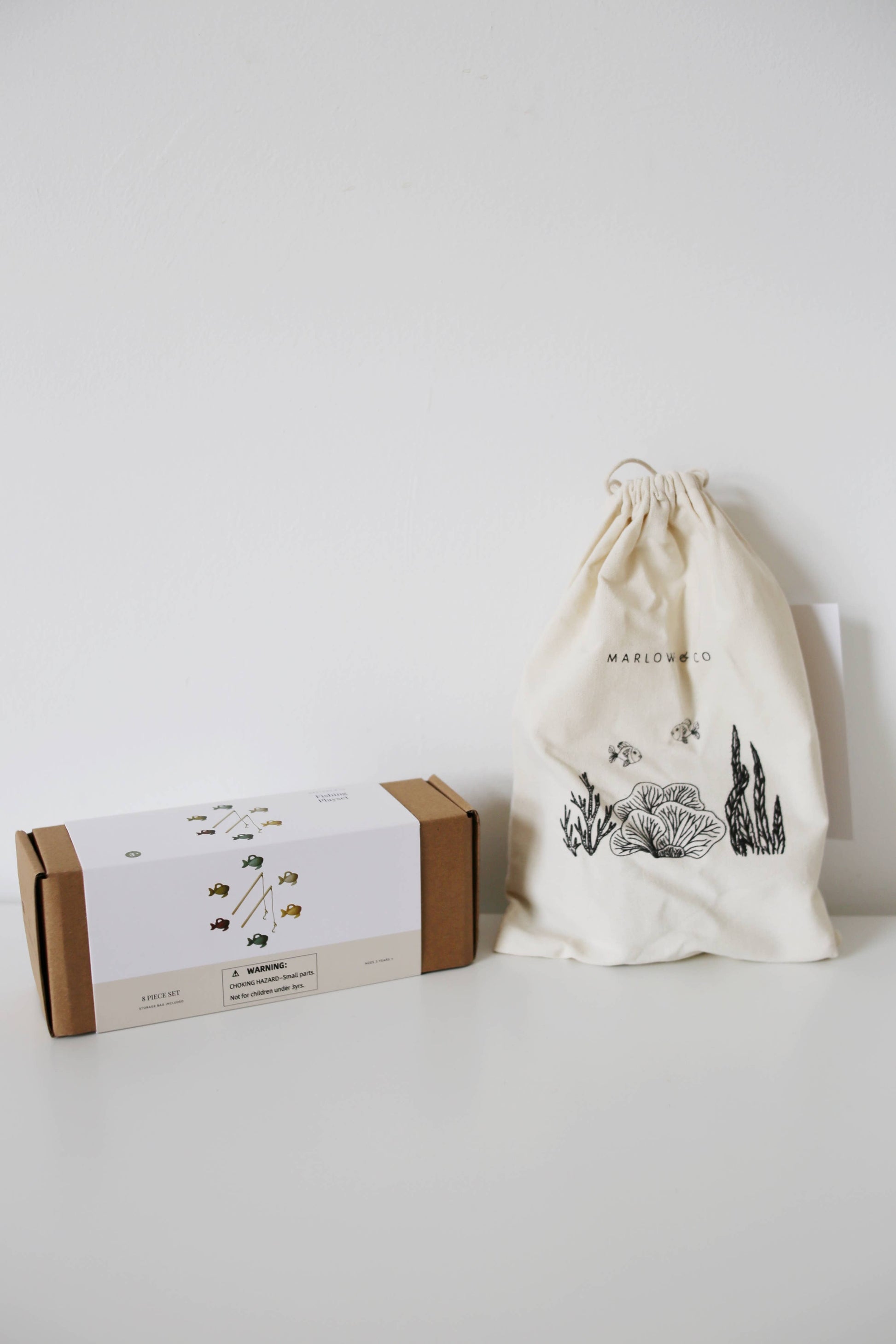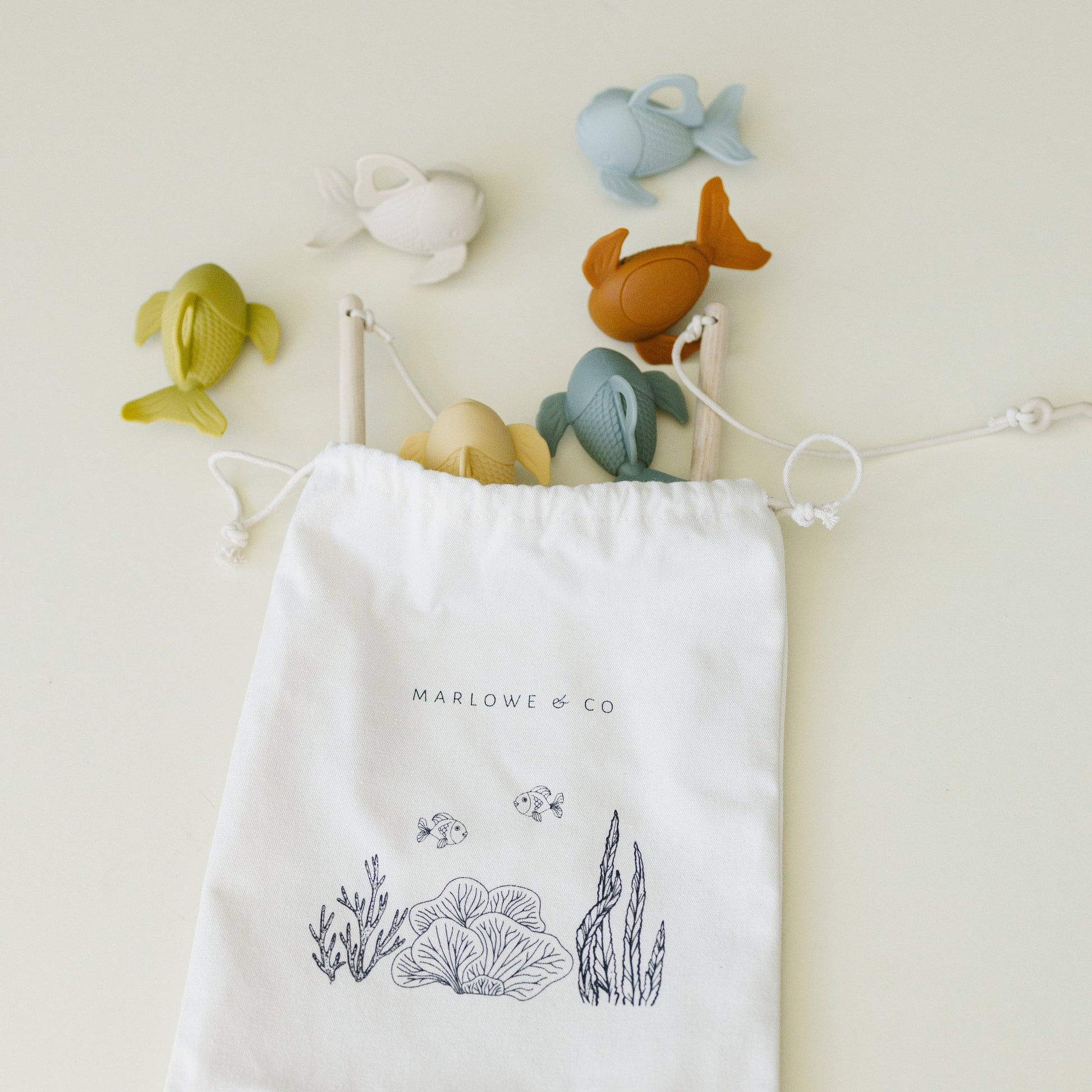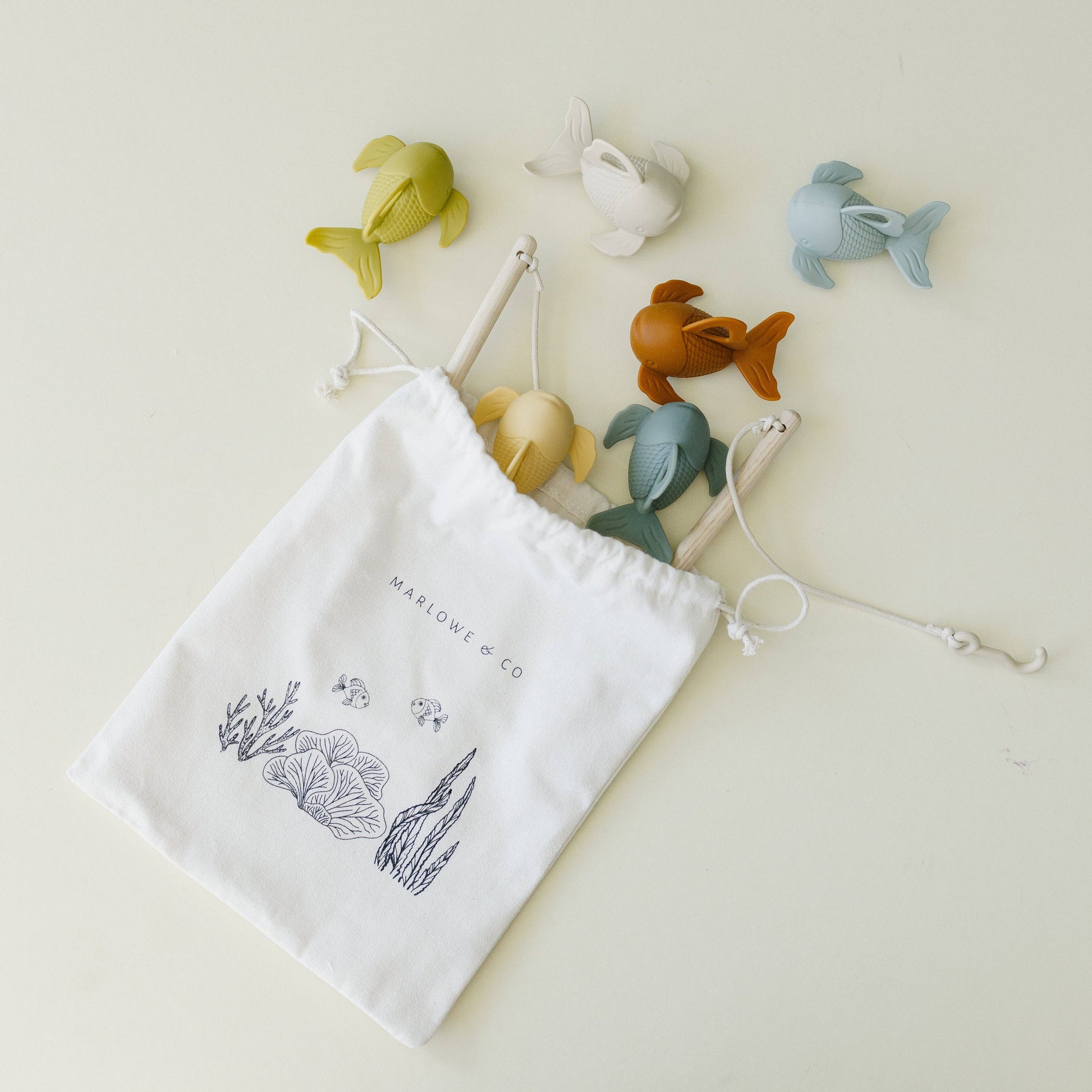 Marlowe & Co's fishing playset will inspire new adventures during playtime! Our fishing set is made from high quality silicone and wood materials, making it durable and safe.